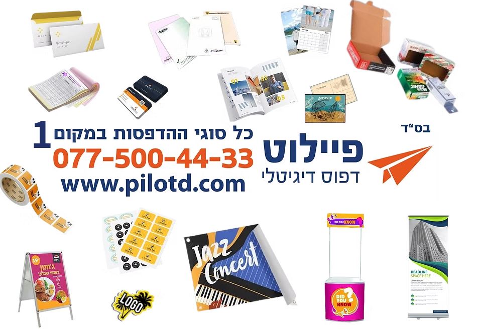 בית הדפוס הדיגיטלי פיילוט מציע מגוון רחב של שירותי הדפסה מקצועיים המותאמים לצרכים העסקיים והאישיים של כל לקוח. אנו מתמחים בהדפסת ספרים באיכות גבוהה, תוך שמירה על פרטי העיצוב והטקסט בצורה מושלמת. השירותים כוללים גם הדפסת מדבקות ומדבקות בולטות המוסיפות מימד חזותי ומישוש ייחודי למוצר. אנו מייצרים פולדרים וקטלוגים מעוצבים המשדרים מקצועיות ומציגים את המידע בצורה ברורה ומסודרת. מחברות ממותגות מאפשרות לעסקים להשאיר חותם אישי ולחזק את הזהות המותגית שלהם. לוחות שנה מודפסים בעיצוב אישי משמשים ככלי שיווקי יעיל לאורך כל השנה. אנו מתמחים גם בהדפסת הגדות פסח, תוך הקפדה על איכות הדפוס ועל עיצוב מכובד ומסורתי. שירותי המיתוג שלנו מאפשרים לעסקים ליצור זהות עיצובית עקבית על פני כל המוצרים המודפסים. עם ניסיון של שלושה עשורים, טכנולוגיה מתקדמת ומחירים נוחים, אנחנו יודעים להפוך כל רעיון למוצר מודפס מושלם. הצוות מלווה את הלקוחות משלב התכנון ועד לקבלת המוצר המוגמר, תוך שירות אישי ויחס חם.