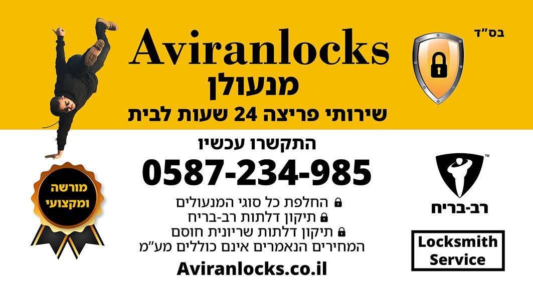 Aviran Locks מציע שירותי מנעולים מקצועיים ומהימנים לתושבי אזור המרכז. החברה מתמחה במגוון רחב של פתרונות אבטחה ונעילה, כאשר הליבה נשענת על מומחיות בפריצת דלתות וכספות במצבי חירום. השירות כולל גם החלפת צילינדרים חכמים המותאמים לצרכי הלקוח, תוך הקפדה על התאמה מדויקת לכל סוג דלת. פתרונות האבטחה בנויים כך שיהיו נגישים ומותאמים לכל כיס, מבלי לוותר על איכות ואמינות. הזמינות המלאה מאפשרת מתן מענה בכל שעות היום והלילה, עם דגש על מהירות תגובה וביצוע ברמה גבוהה. הניסיון המצטבר מבטיח פתרון יעיל לכל אתגר נעילה, תוך שילוב של ידע טכני עם שירותיות מעולה והבנה שכל מצב חירום דורש טיפול מיידי ושביעות רצון מלאה של הלקוחות. לקבלת שירות מנעולן אמין, צרו קשר עוד היום.